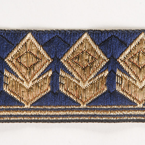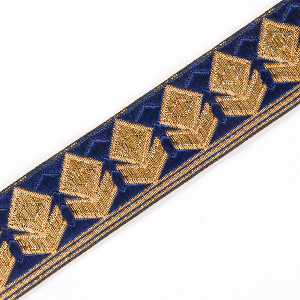Stuha žakárová geometrický vzor tm.modrá s kovovým vláknem zlaté barvy s výšivkou zlatých geometrických tvarů.Stuha žakárová geometrický vzor tm.modráStuha tmavě modré barvy se zlatým geometrickým vzorem, je vhodná na dozdobení oděvu, dobového kostýmu či aplikaci na tašky, klobouky a podobně.