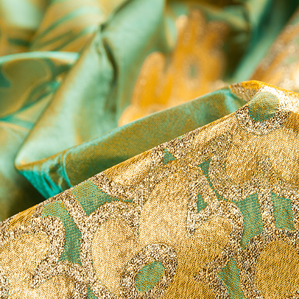 Hladký jemný taft metráž - látka žakárový jednostranný taft s efektním vzorem zlatých květů na šanžán tyrkysovo-okrovém podkladě. Látka je lehce splývavá, má svůj charakteristický ostrý omak a elegantní vzhled.