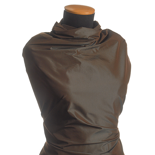 Taft šanžán hnědý/tyrkysový - látka šanžánový taft v barvě hnědé/tyrkysové. Látka má svůj charakteristický ostrý omak, má lehce lesklý povrch a elegantní vzhled.Taft šanžán hnědý/tyrkysový