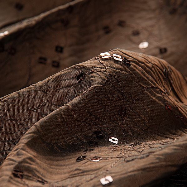 Vyšívaný taft metráž v barvě tmavě hnědé s jemnou květinovou výšivkou doplněnou flitry ve tvaru čtverečku tmavě hnědé barvy. Látka má charakteristický ostrý omak, má lehce lesklý povrch a elegantní vzhled. Nemačká se, je mírně splývavá a drží tvar.