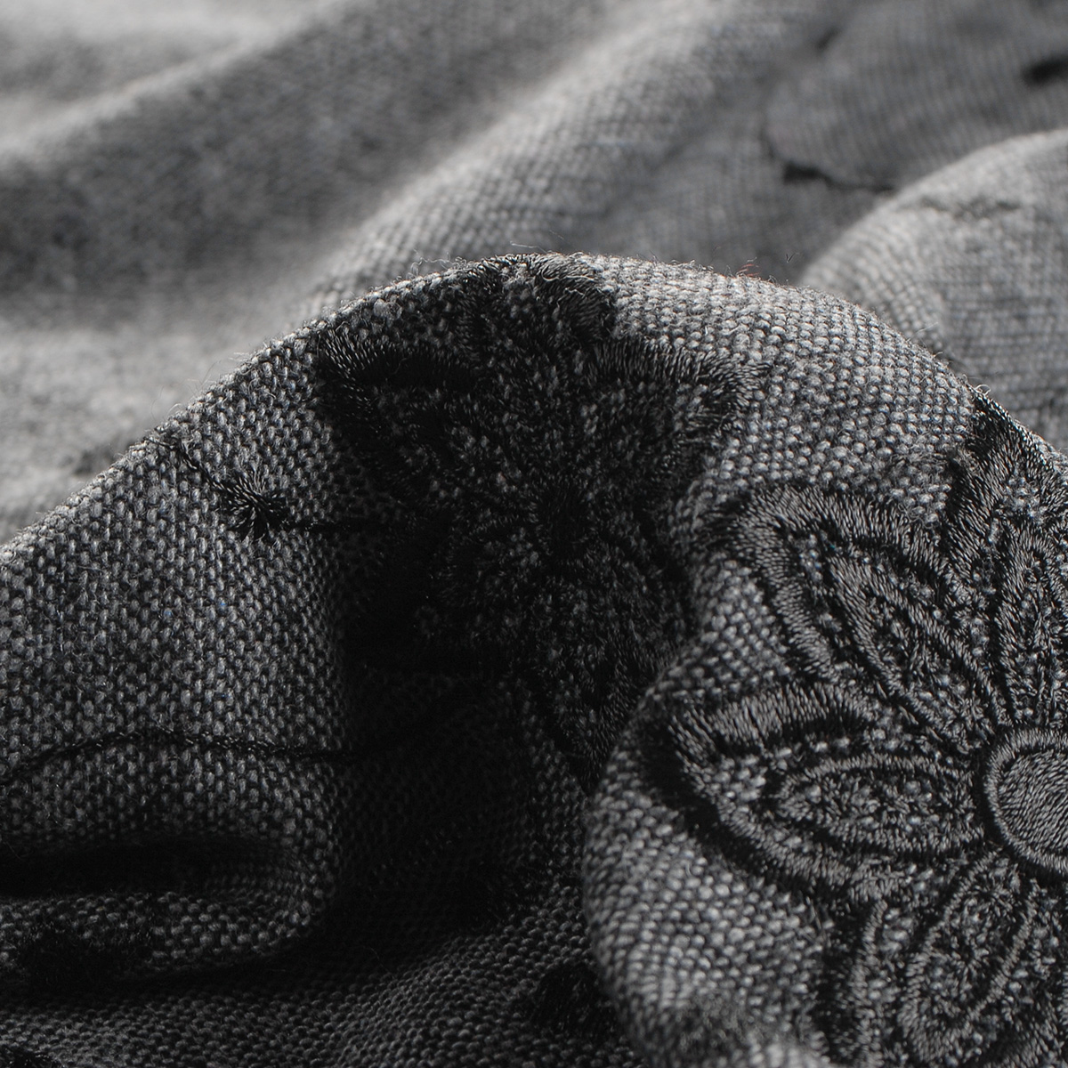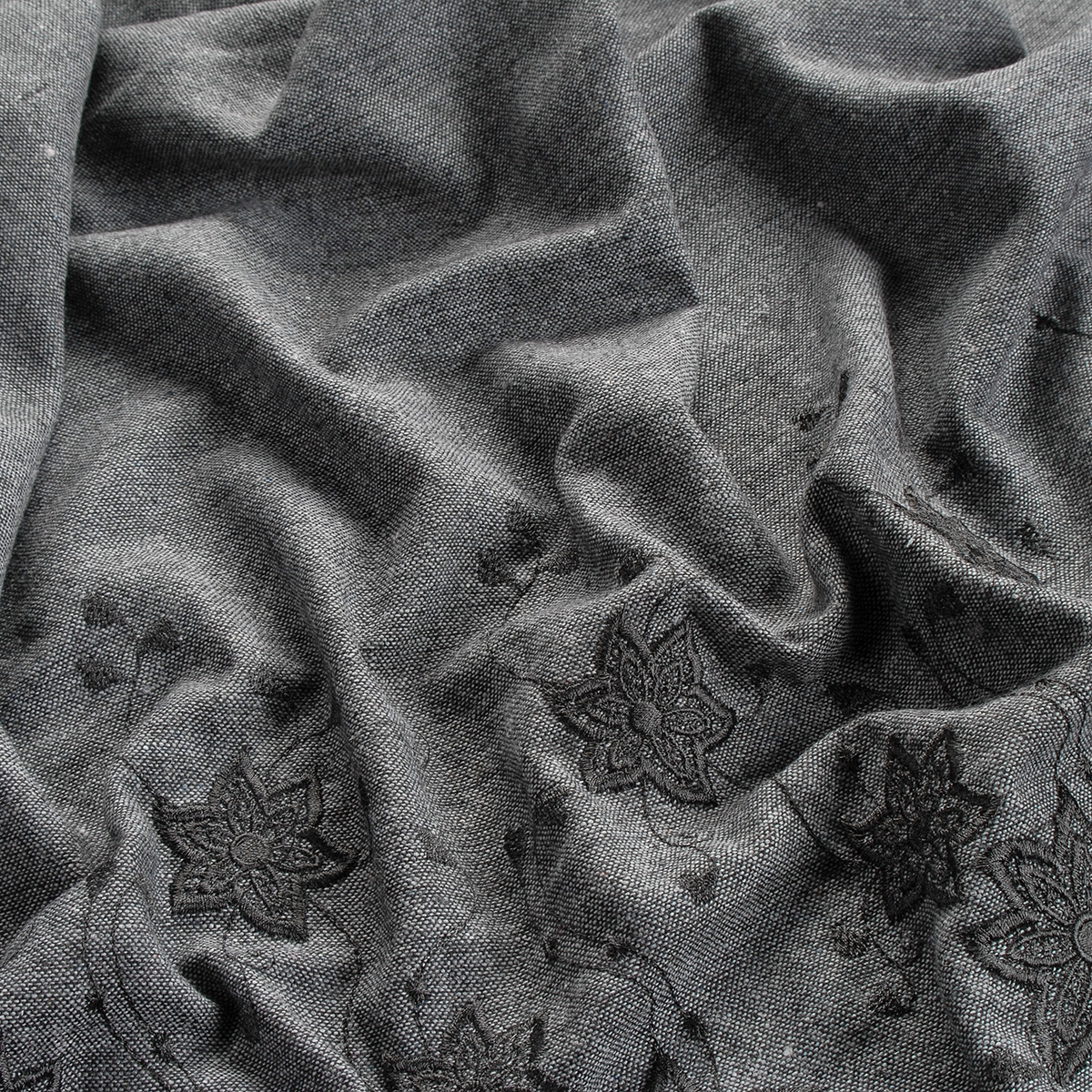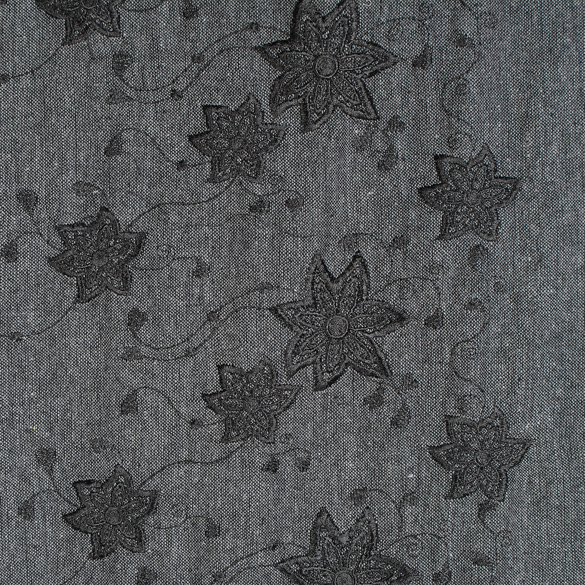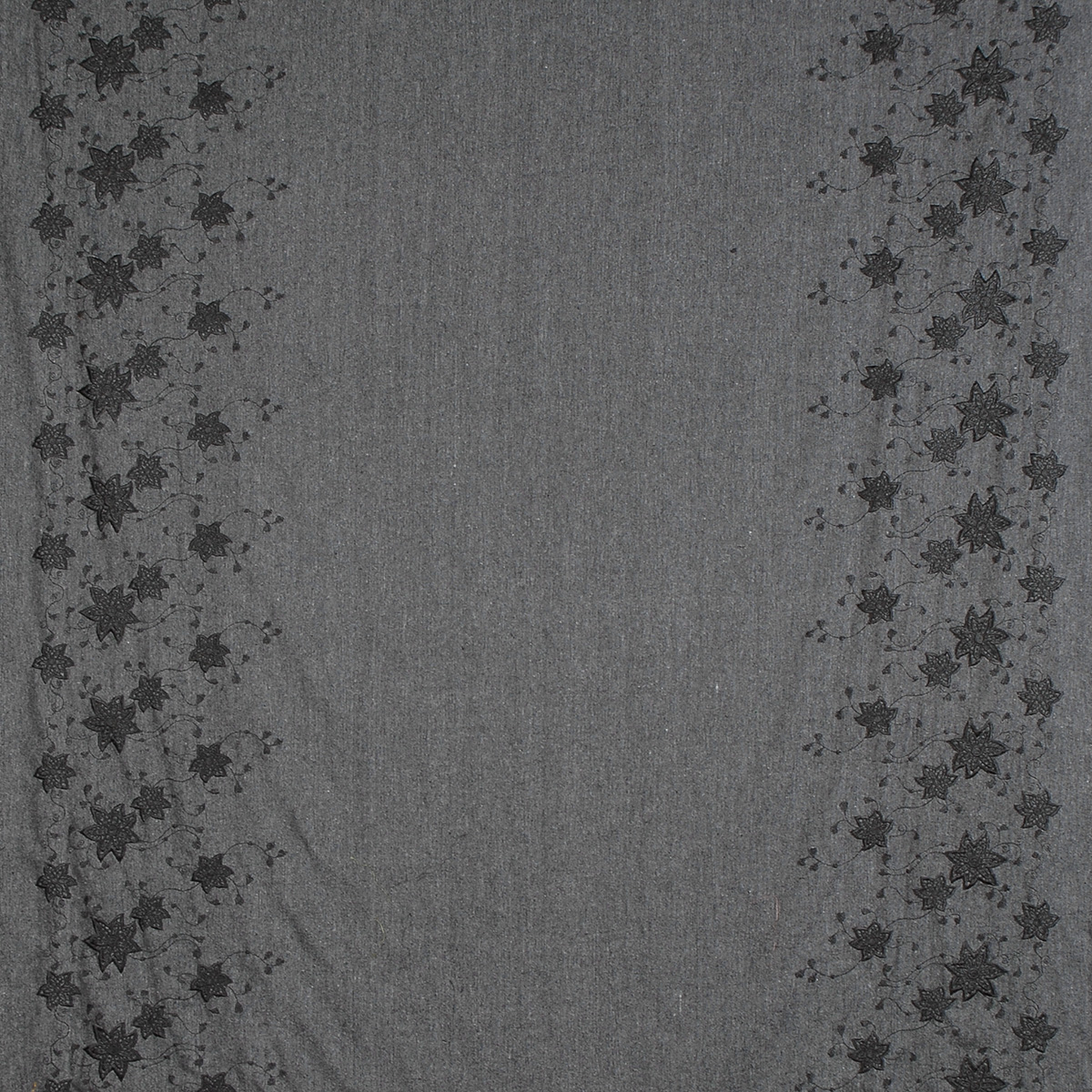Tato exkluzivní látka v úpravě tvíd s výšivkou zaujme na první pohled. Dominantou je decentní květinový vzor v černé barvě, který vyniká na černošedém podkladu. Látka se pyšní charakteristickým tvídovým omakem a samotná výšivka dodává materiálu lehce plastický a luxusní vzhled.