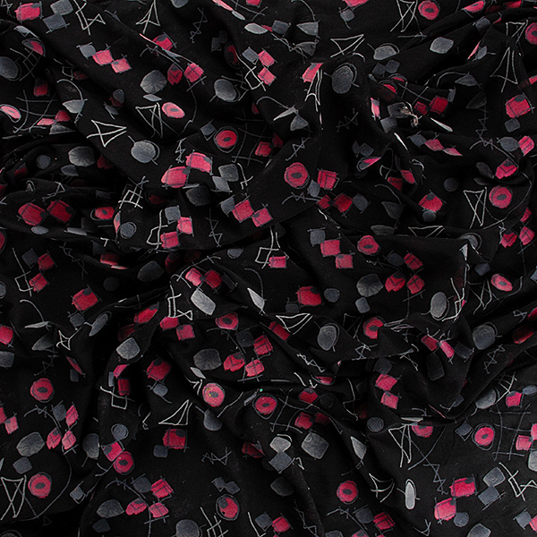 Tyl pružný jemný - látka černé barvy s efektním sametovým flockem v barvách šedé a růžové s geometrickým vzorem. Metráž je pružná, splývavá a průsvitná. Hodí se na efektní tuniky i elegantní trika.