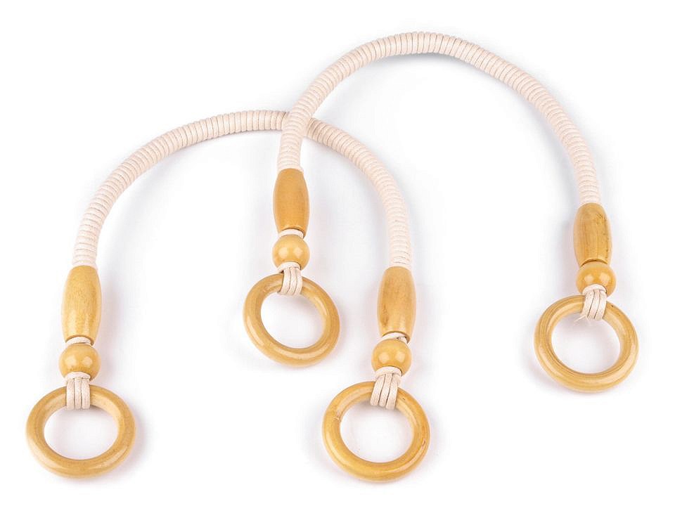 Ucha na tašky točená šňůra korálky přírodní ucha na tašku v příordní světle hnědé barvě tvořena textilní šňůrou zakončenou dřeveným kroužkem. Ucha na tašky točená šňůra korálky přírodní jsou určena pro lehkou zátěž tašky doporučeno max 4-5kg.