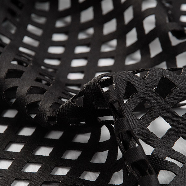 Úplet prořezávaný geometrický vzor- středně silný úplet se vzdušným plastickým geometrickým vzorem kosočtverců v černé barvě. Úplet prořezávaný geometrický vzor je pružný, splývavý a ve vzrou průsvitný.