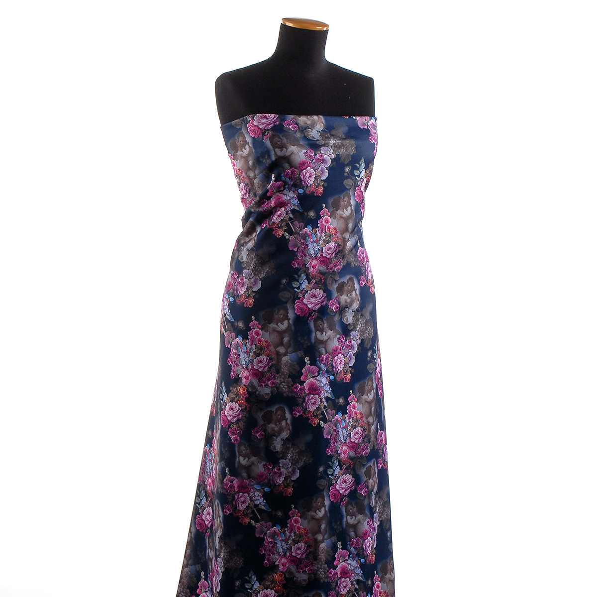 Úplet středně silný Punto tisk andílci tm.modrá - pletenina střední síly Punto di Roma se vzorem adnílků šedé barvy a větším květinovým vzorem tmavě fialové barvy na tmavě modrém podkladě. Úplet středně silný Punto tisk andílci tm. modrá - je dvojitý pletený úplet s vyšší gramáží, je příjemný na omak, má matný haldký a hezky splývavý povrch. Punto di Roma je látka pružná v obou směrech, převážně do šířky, není průsvitná, digitální tisk je pouze z líce látky, rub je bílé barvy.