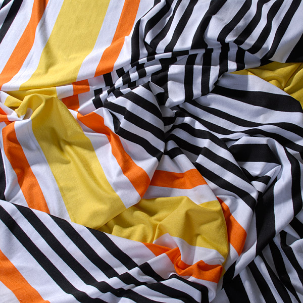 Úplet metráž - jemný úplet motiv proužků v barvách černé, žluté, oranžové a bílé. Látka je pružná a splývavá.