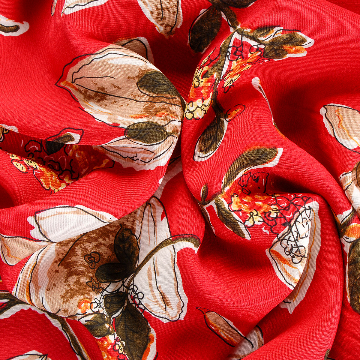 Šatová viskozová látka s romantickým vzorem květů v hnědokrémových barvách na malinově červeném podkladě vhodná na letní šaty. Viskozová šatovka je jemná, splývavá a pružná látka. Není průsvitná, nepotřebujete tedy podšívku, má matný povrch a je velmi příjemná na omak.
