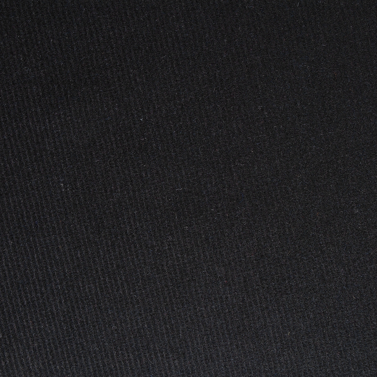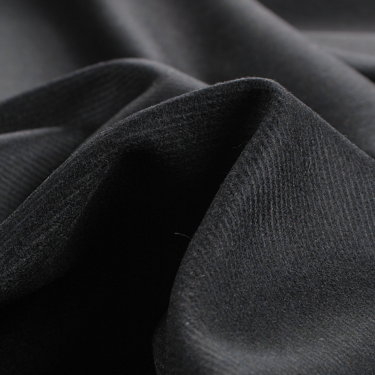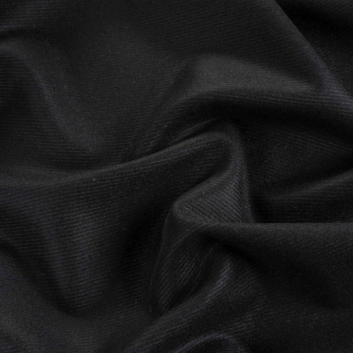 Vlněná látka z panenské vlny v černé barvě s jemným vlasem a plastickou strukturou šikmých proužku podobných rypsové vazbě. Látka je střední síly vhodná na teplejší sako, či lehký kabát, je poddajná a lehce splývavá.