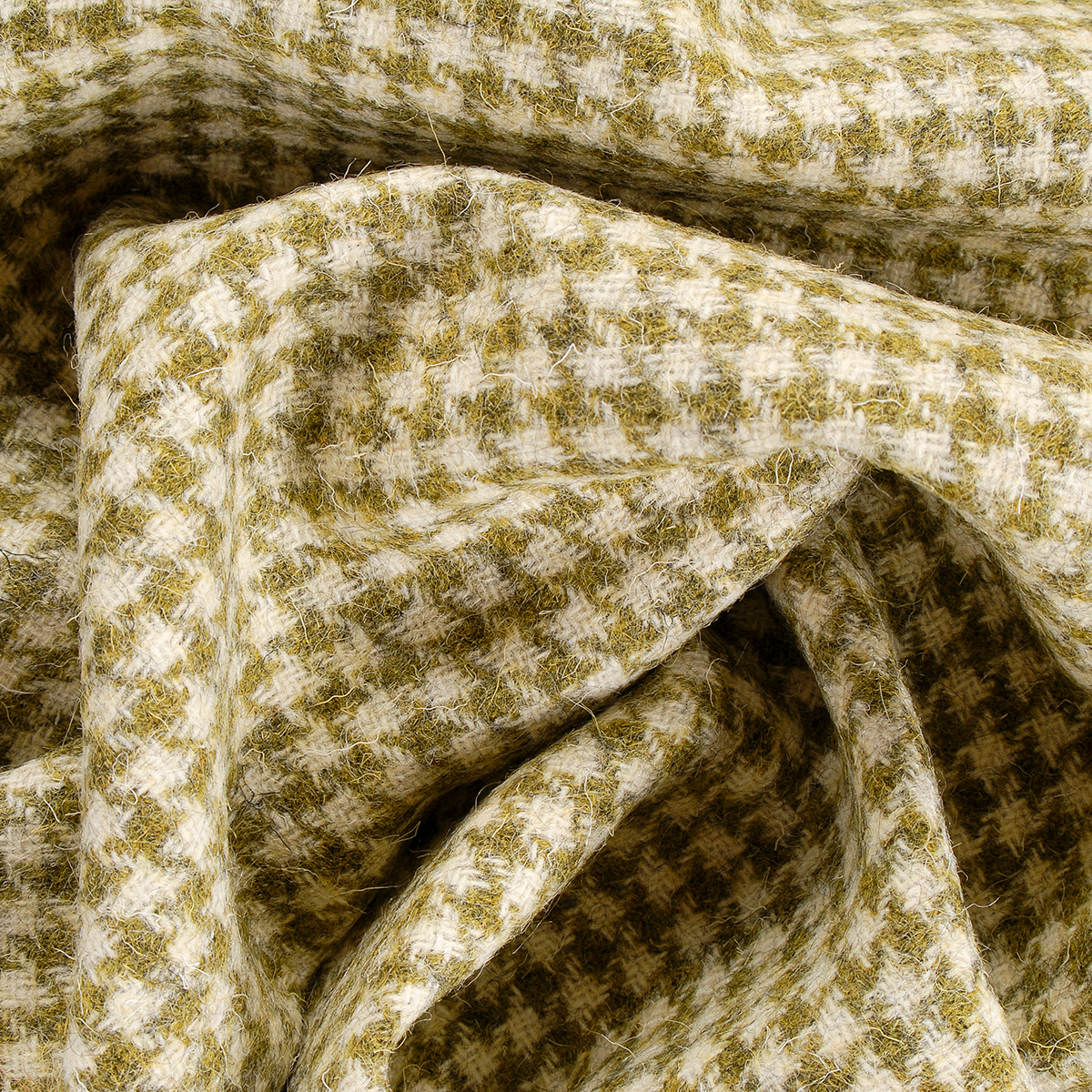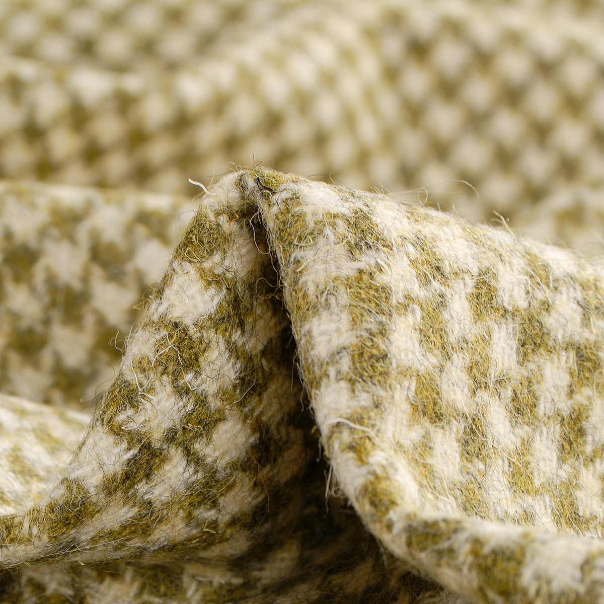 Kostýmová vlněná látka vzor pepito, neboli kohoutí stopa, v teplých barvách mechově zelené a smetanové. Látka je silnější, hutně tkaná a jen lehce pružná svou vazbou. Má klasický vlněný vlas, který skvěle zahřeje.