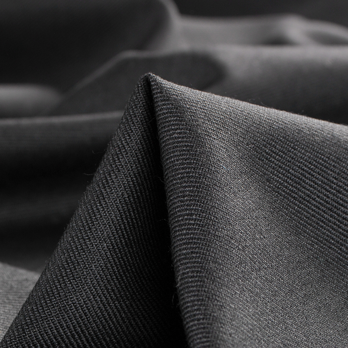 Kostýmová vlněná látka s příměsí polyamidu v černé barvě s jemným vlasem a plastickou strukturou šikmých proužku podobných rypsové vazbě. Látka je střední síly vhodná na kostým, sako, tubovou sukni, nebo i kalhoty. Tkanina je poddajná, mírně pruží svou vazbou a je lehce splývavá.
