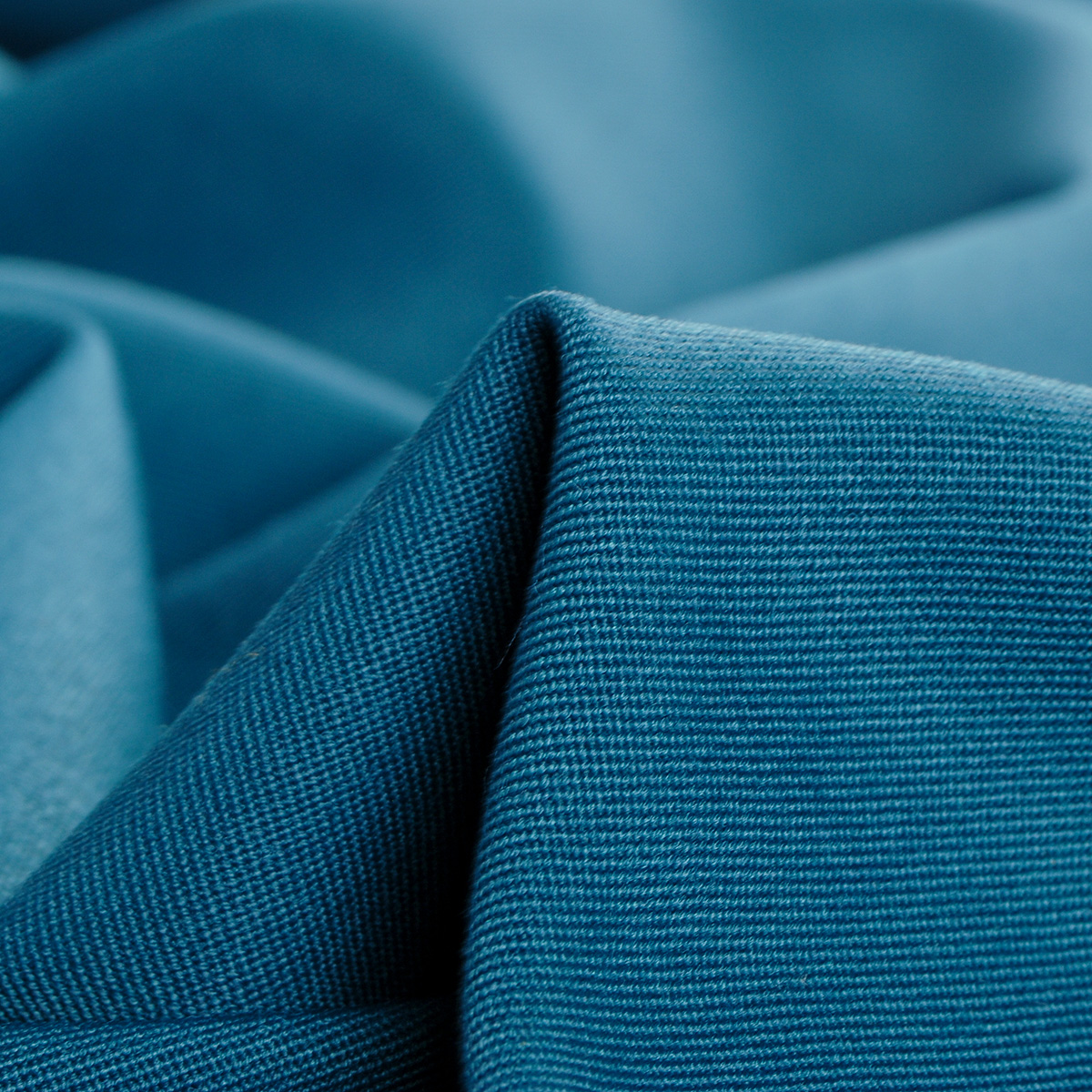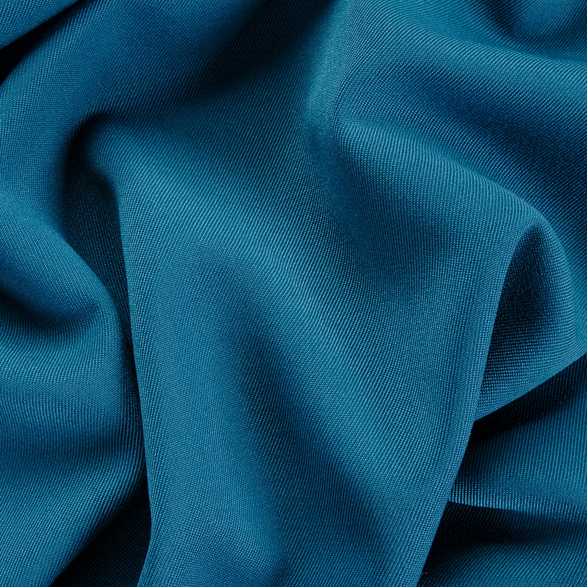 Kostýmová vlněná látka s příměsí polyamidu v petrol tyrkysové barvě s jemným vlasem a plastickou strukturou šikmých proužku podobných rypsové vazbě. Látka je střední síly vhodná na kostým, sako, tubovou sukni, nebo i kalhoty. Tkanina je poddajná, mírně pruží svou vazbou a je lehce splývavá.
