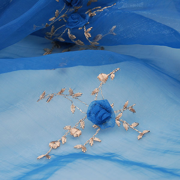 Vyšívaná organzová metráž s motivem drobných stužkových růží uložených v kontrastní krémové výšivce na modrém podkladu. Látka je průsvitná a mírně splývá.