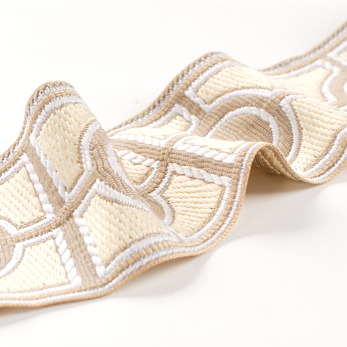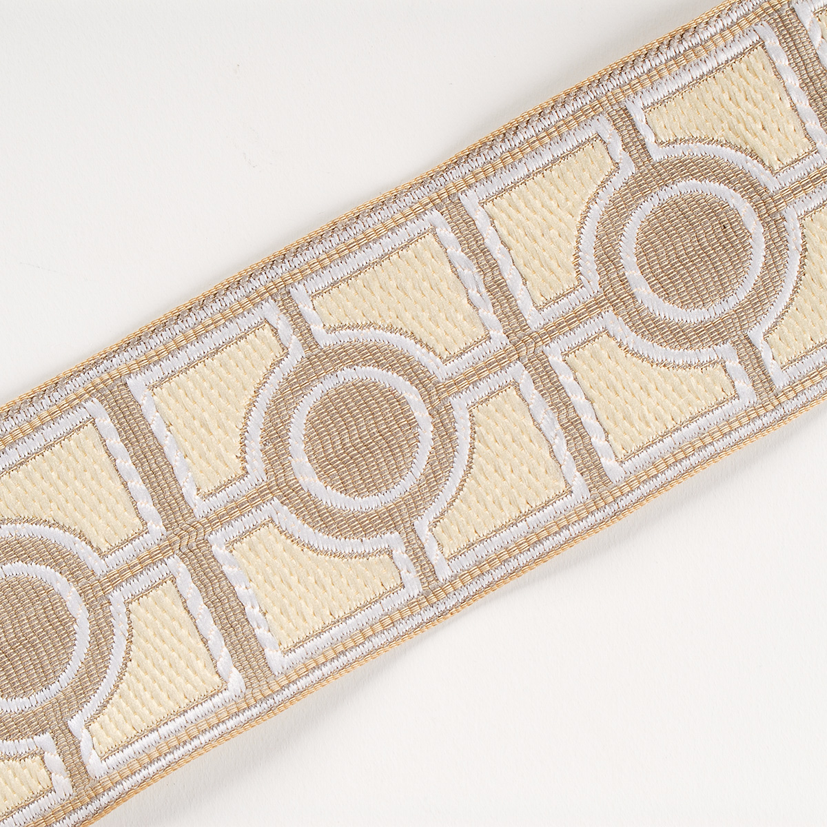 Elegantní vyšívaná stuha s geometrickým vzorem v barvách béžové a bílé barvy na šedém podkladu. Stuha s výšivkou neboli textilní porta je vhodná na dozdobení oděvu. Oceníte je určitě při šití nevšedních svatebních šatů, renesančního historického dobového kostýmu nebo zdobení tašky, klobouku a podobně.