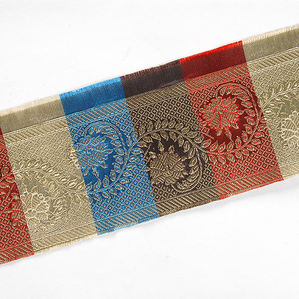 Vyšívaná stuha s kovovým vláknem zlaté barvy. Vyšívaná stuha je barvách modré, zlatobéžové, červené a hnědé s květinovým ornamentem, je vhodná na dozdobení oděvu, dobového kostýmu či aplikaci na tašky, klobouky a podobně.