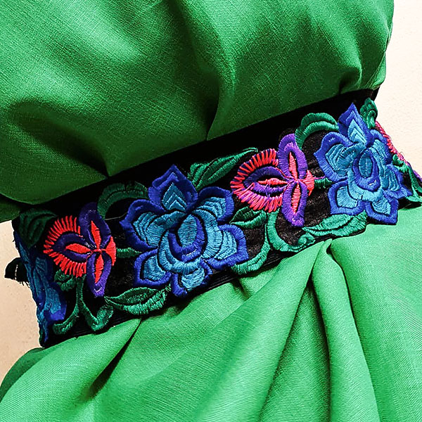 Vzor:Stuha je široká cca 8 cm,modré květy jsou velké cca 8 cm,doplňují je fialovorůžovélisty jsou velké cca 5x5 cm,krajka má okraje zdobené výšivkou zelených listů.Použití::