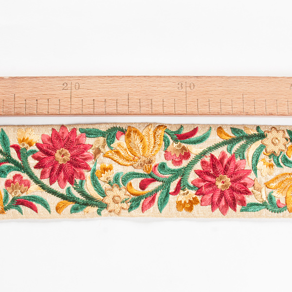 Vyšívaná stuha - výšívaný šantung s květinovým vzorem v barvách žluté, zlaté, zelené a červené na podkladě zlatobéžové barvy. Vyšívané stuhy neboli textilní porty borty jsou vhodné na dozdobení oděvu. Oceníte je určitě při šití nevšedních svatebních šatů, renesančního historického dobového kostýmu nebo zdobení tašky, klobouku a podobně.
