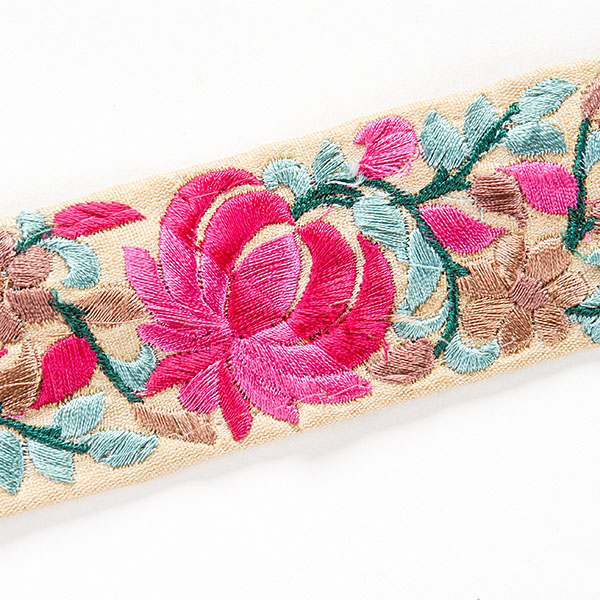 Vyšívaná stuha - výšívaná užší šantung stuha s menším květinovým vzorem sytě růžové,tyrkysové,zelené a hnědé barvy na béžovém podkladu.Vyšívaná stuha neboli textilní porty borty jsou vhodné na dozdobení oděvu. Oceníte je určitě při šití nevšedních svatebních šatů, renesančního historického dobového kostýmu nebo zdobení tašky, klobouku a podobně.