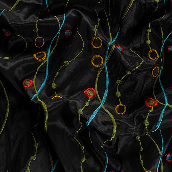 Vyšívaný taft vyšívaný taft v černé barvě s geometrickým vzorem pramínků a koleček. Vyšívaný taft taftová látka s lesklým povrchem nemačká se, je mírně splývavá a drží tvar.