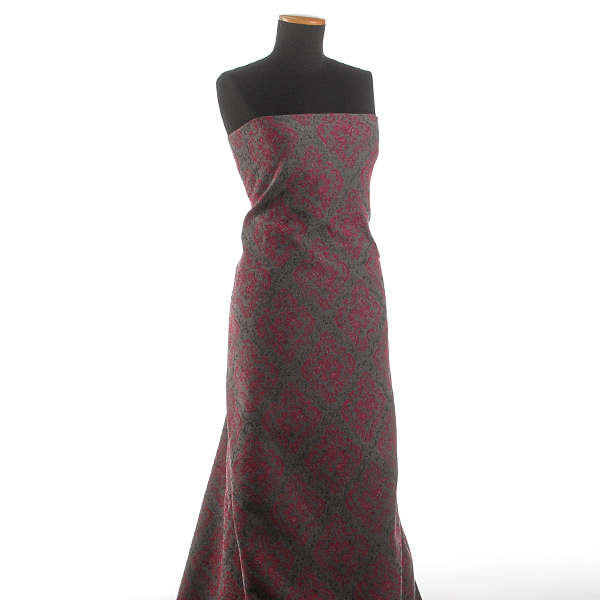 Replika historické látky- žakárová dekorační tkanina s ornamentálním vzorem v sytě růžové barvě na šedém podkladě. Repliku historické látky můžete použít na historické šaty z období rokoka. Replika historické tkaniny byla vyrobená v naší vlastní tkalcovně na Vysočině.
