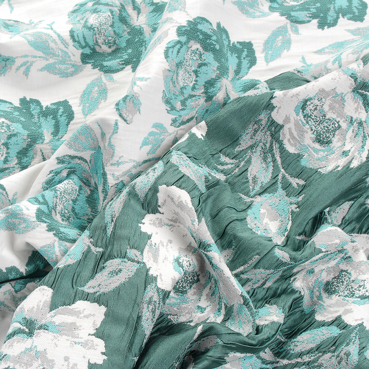 Žakárová látka květinový vzor tyrkysovobílá elegantní žakárová tkanina oboustranná se vzorem růží v tyrkysový, smaragdově zelných, šedých a bílých barvách.Žakárová látka květinový vzor tyrkysovobílá je pružná a dost pevná i na sako nebo lehký kabátek, pro větší efekt ji můžete použít i oboustranně - z jedné strany je tmavě modrá s bílými květy a z druhé strny je bílá s modrými květy.