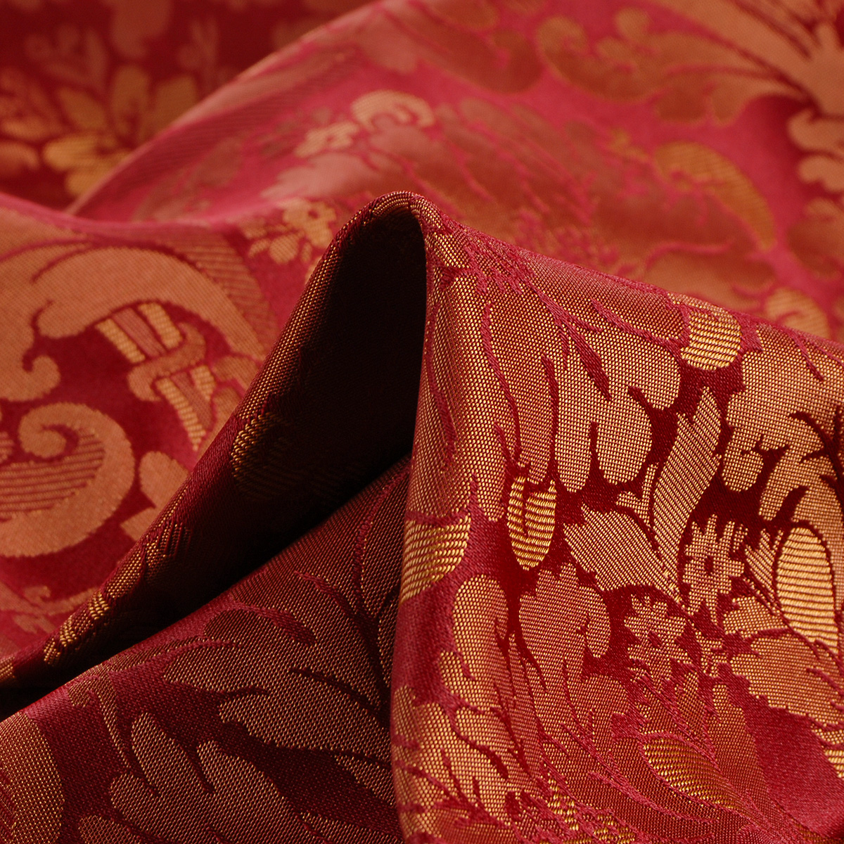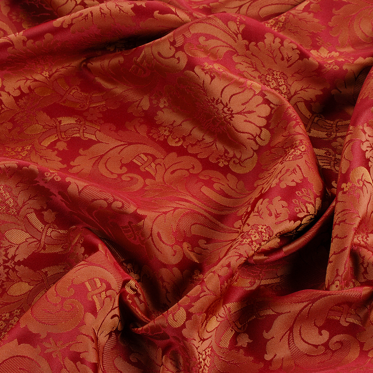 Dekorační žakárová látka květinový vzor v barvách vínovozlatých. Brokátová žakárová tkanina je středně silná, není průsvitná a lze ji použít na dobové šaty, nebo i zdobný ubrus, běhoun či dekorační polštář. Žakárový vzor je oboustranný, pro větší efekt tedy můžete libovolně kombinovat obě barevné variace.
