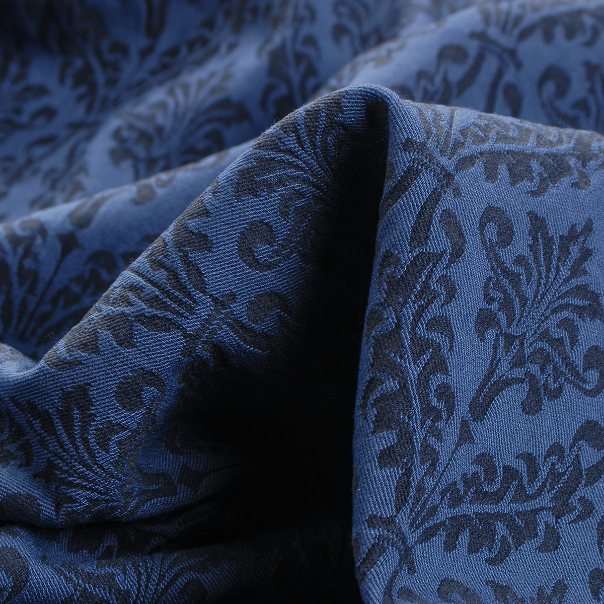 Žakárová látka ornament tm.modrá v barvách modré na tm.modrém podkladě.Žakárová látka ornament tm.modrá je pružná a dost pevná i na sportovní sáčko.