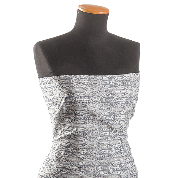 Pružná žakárová látka s ornamentální vzorem v barvách slonové kosti na modrém podkladě.Metráž je pružná a dost pevná i na sportovní sáčko.